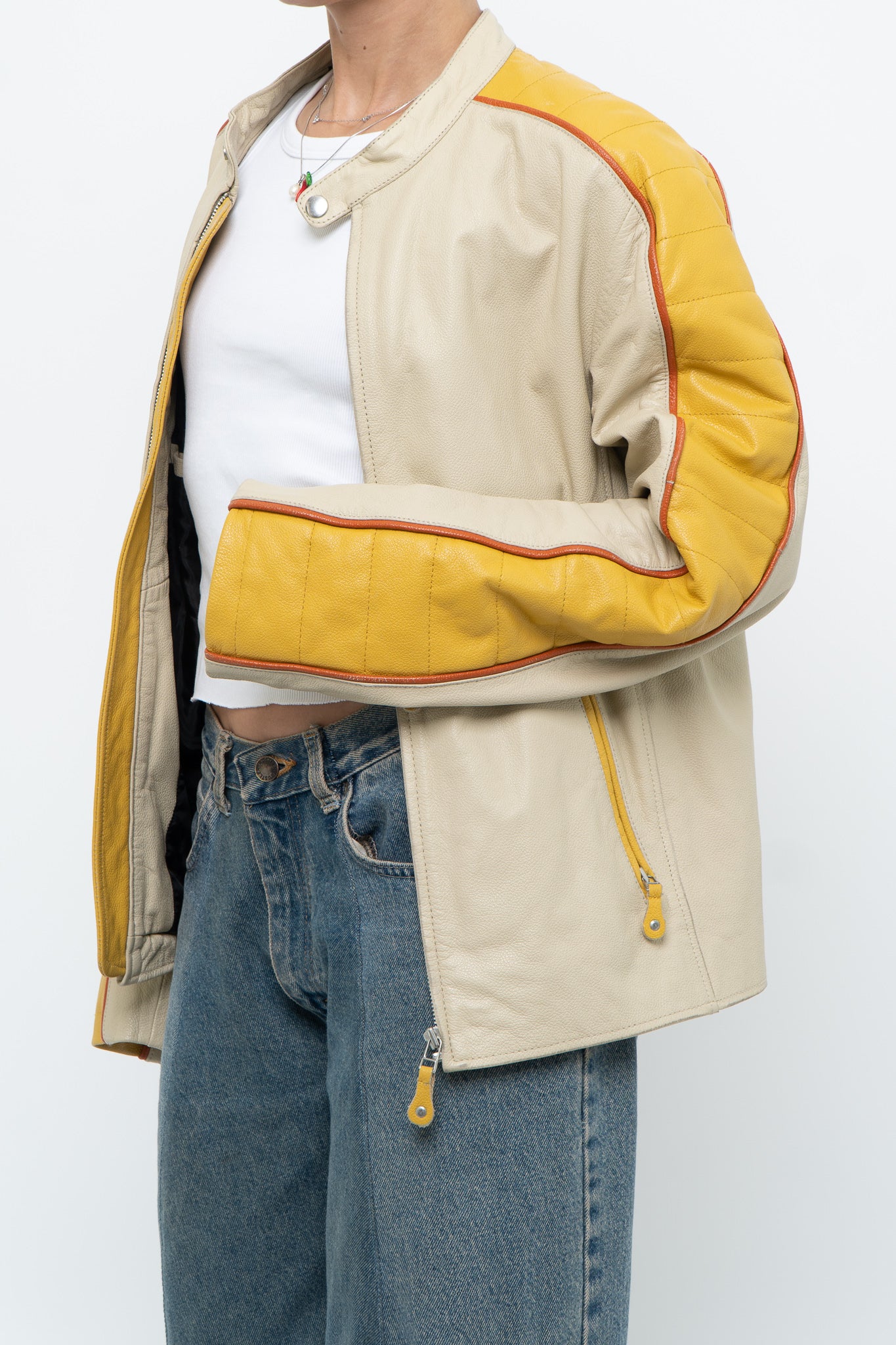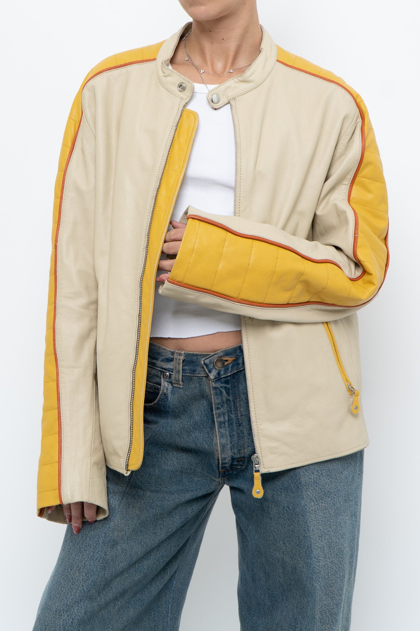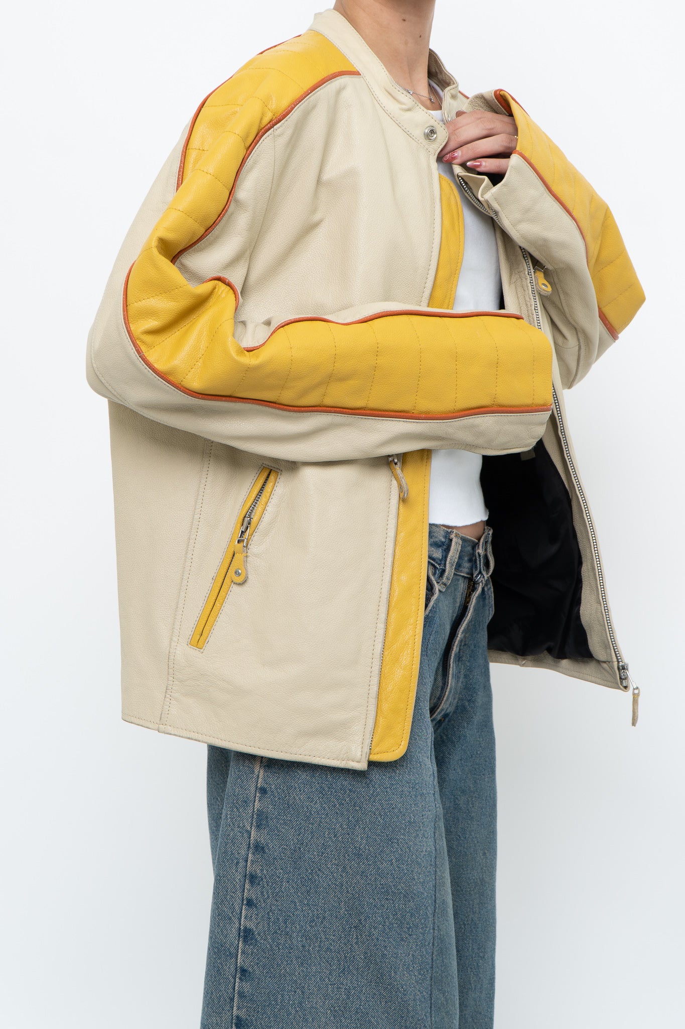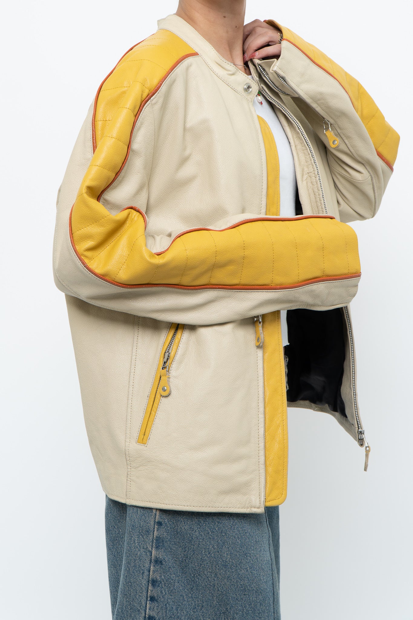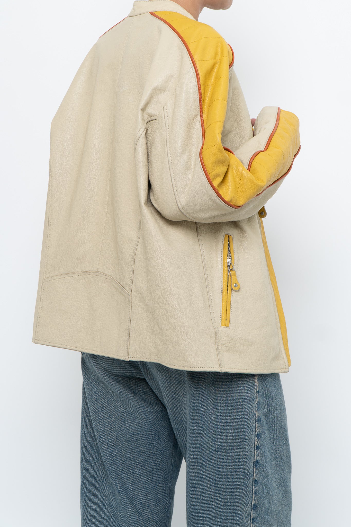 Condition: perfect wear, one pocket zipper stuck halfway / Marked M suits S-L / Genuine Leather / Pit to pit 20" Length 25"